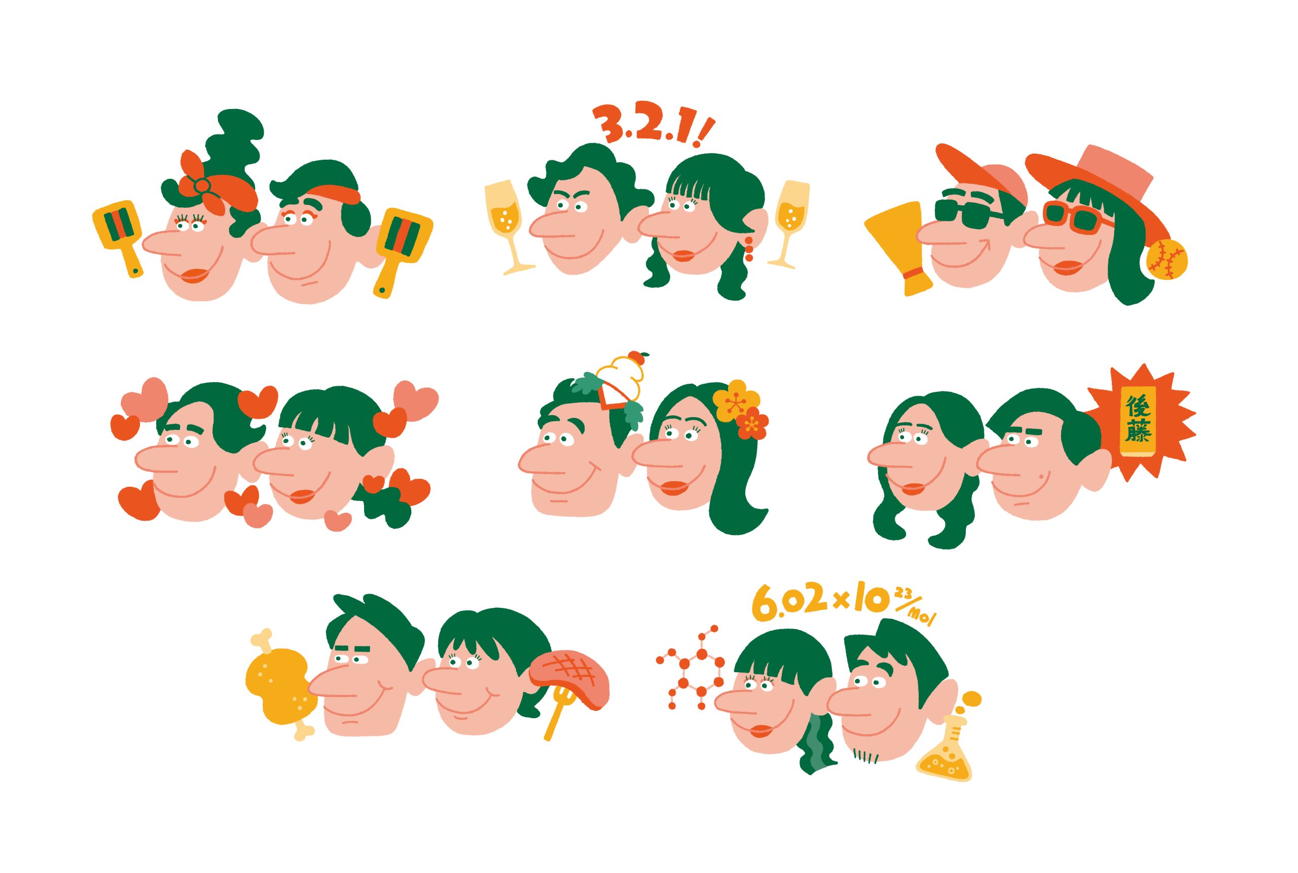 ご夫婦の似顔絵に、記念日に関連したアイテムを添えて